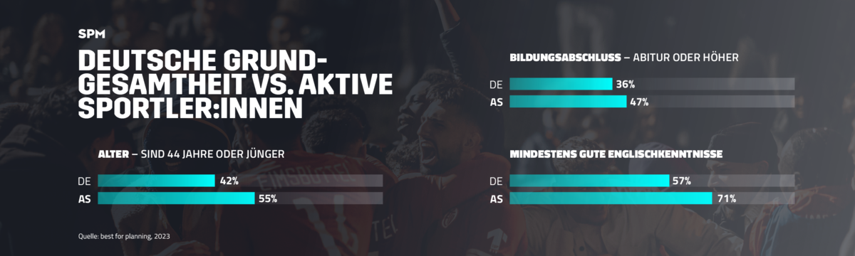 Die aktiven Sportler:innen besitzen zahlreiche Eigenschaften, die für Dein Unternehmen bei der Suche nach neuen Mitarbeiter:innen von großem Wert sind. Beim Vergleich dieser spezifischen Zielgruppe mit der Gesamtbevölkerung Deutschlands fällt zudem auf: Die aktiven Sportler:innen sind nicht nur im Schnitt deutlich jünger, sondern auch intelligenter. 47 % besitzen als höchsten Bildungsabschluss ein Abitur oder sogar ein Studium. Daraus ergibt sich, dass die aktiven Sportler:innen auch in anderen Bereichen, wie beispielsweise den sprachlichen Fähigkeiten, besser abschneiden.