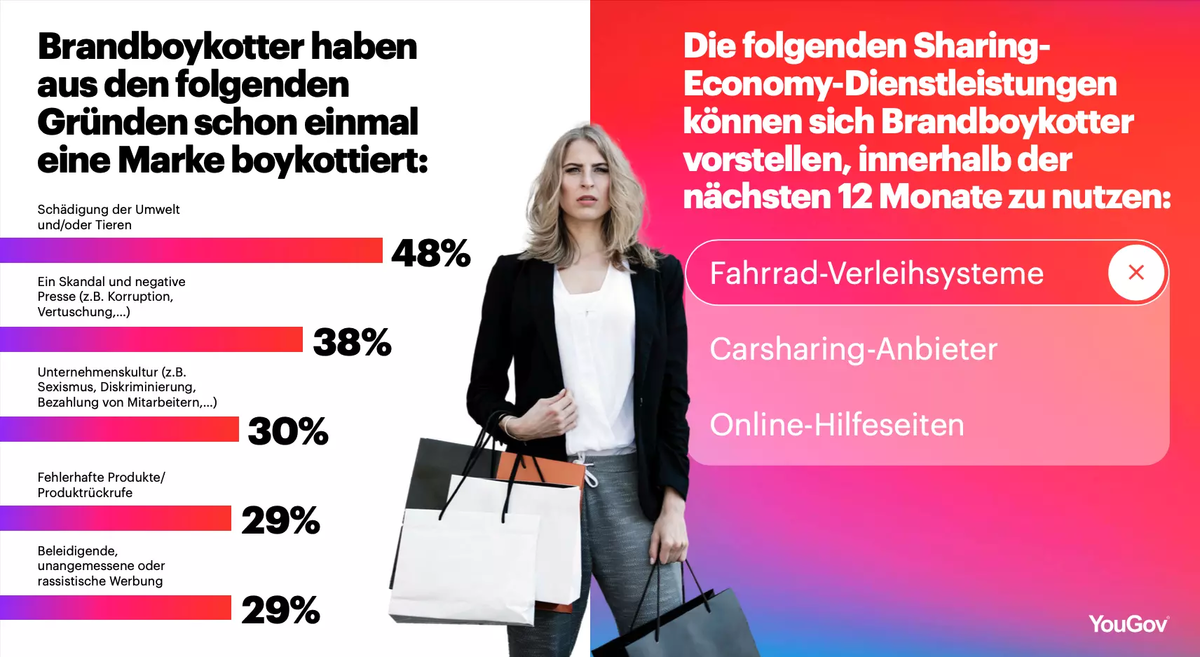Knapp die Hälfte der deutschen Brandboykotter (48 Prozent) gibt als Grund für ihren Markenboykott die Schädigung der Umwelt oder an Tieren durch die Marke an. 38 Prozent nennen einen Skandal und negative Presse als Grund. Drei von zehn (30 Prozent) begründen ihren Markenboykott mit ihrer Kritik an der Unternehmenskultur der Marke, beispielsweise wenn diese sexistisch oder diskriminierend ist. Jeweils 29 Prozent der Brandboykotter kritisieren fehlerhafte Produkte oder auch beleidigende, unangemessene Werbung.