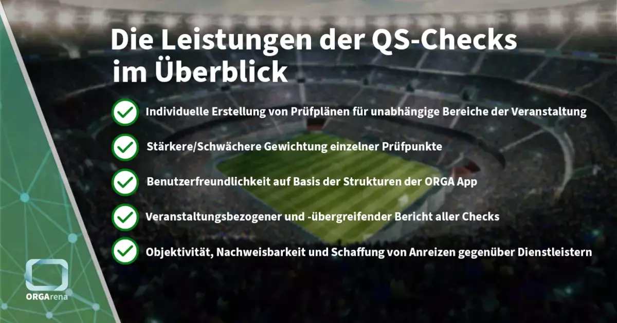 Eine digitale Lösung bildet die ORGA App von ORGArena. Mithilfe des Zusatzmoduls „QS-Checks“ können Dienstleister und Bereiche mit direktem Besucherkontakt, wie Catering, Hospitality oder Reinigung, anhand eines individuell erstellten Prüfplans bewertet werden. Dabei werden die spezifischen Anforderungen der Prüfobjekte berücksichtigt. Bei einem Verkaufsstand kann beispielsweise die Qualität der Speisen und Getränke bewertet werden, während für Mitarbeiter des Ordnungsdienstes geprüft wird, ob das Erscheinungsbild und der Umgang mit den Gästen stimmen. Die Checks können von jedem ORGA App-Nutzer durchgeführt werden – egal ob offen oder verdeckt per Mystery Check.