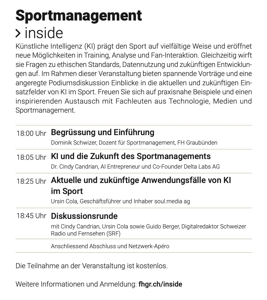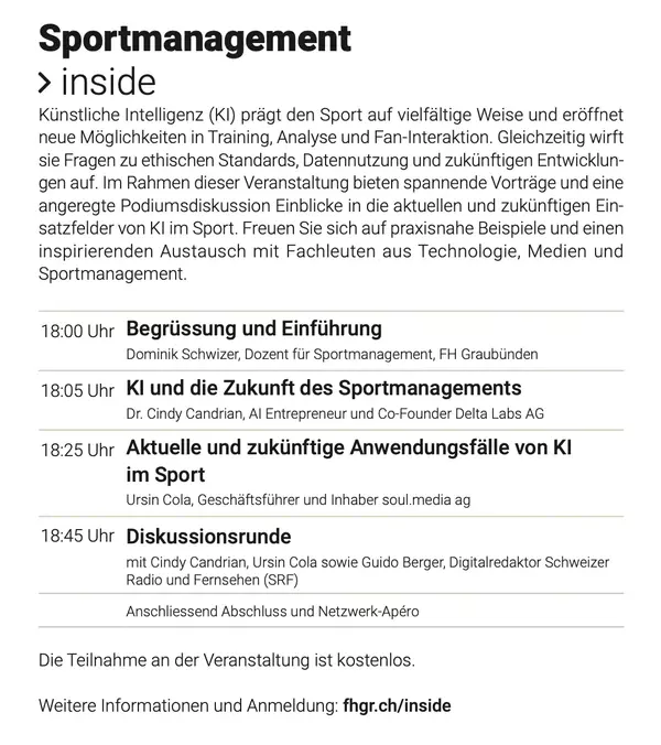 Das Thema „Künstliche Intelligenz in der Sportwirtschaft“ wird auch bei der Veranstaltung «Sportmanagement inside» am 17. März 2025 an der Fachhochschule Graubünden vertieft diskutiert. Die Veranstaltung bietet spannende Vorträge und Diskussionen mit Expertinnen und Experten aus der Branche.