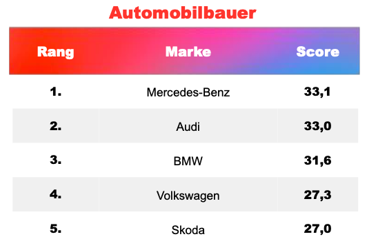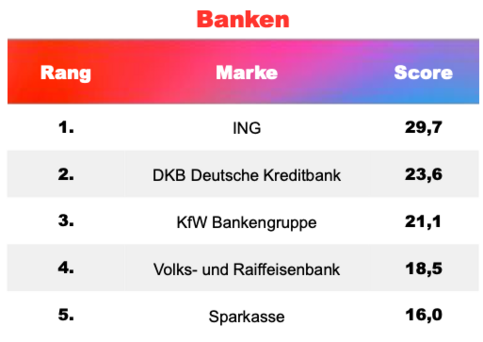 Der Index-Wert oder Punktwert einer Marke steht hierbei für ihr mittleres Abschneiden unter ihren Markenkennern auf sechs unterschiedlichen Bewertungsdimensionen: Allgemeiner Eindruck, Qualität, Preis-Leistungs-Verhältnis, Kundenzufriedenheit, Weiterempfehlungsbereitschaft und Arbeitgeberimage. Positive und negative Verbraucherbewertungen auf den einzelnen Bewertungsdimensionen werden vorab miteinander verrechnet. Der für dieses ausgewiesene Ranking genutzte Index-Wert versteht sich somit als mittlerer Anteil an Netto-Promotoren unter allen Kennern einer Marke.